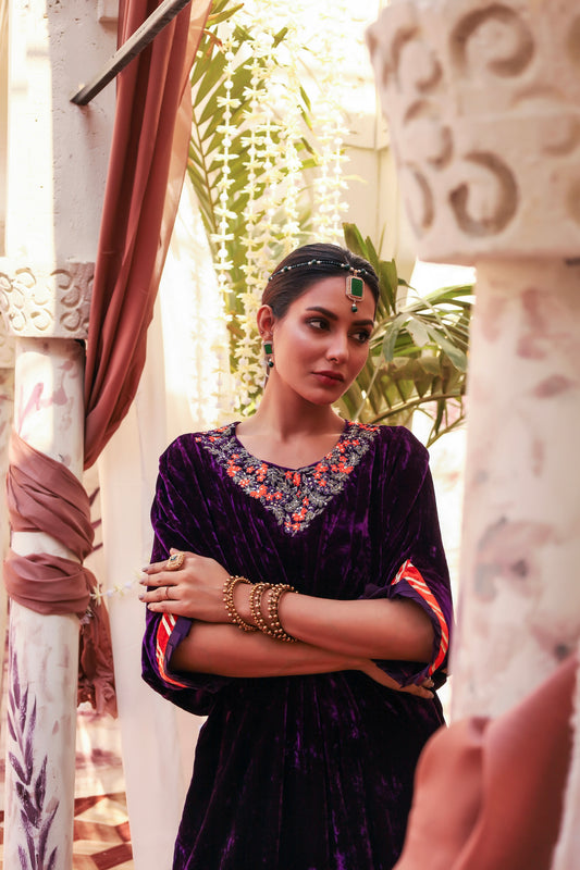 SEEMA KAFTAN, CHURIDAR IN SILK VELVET AND DUPATTA IN SILK