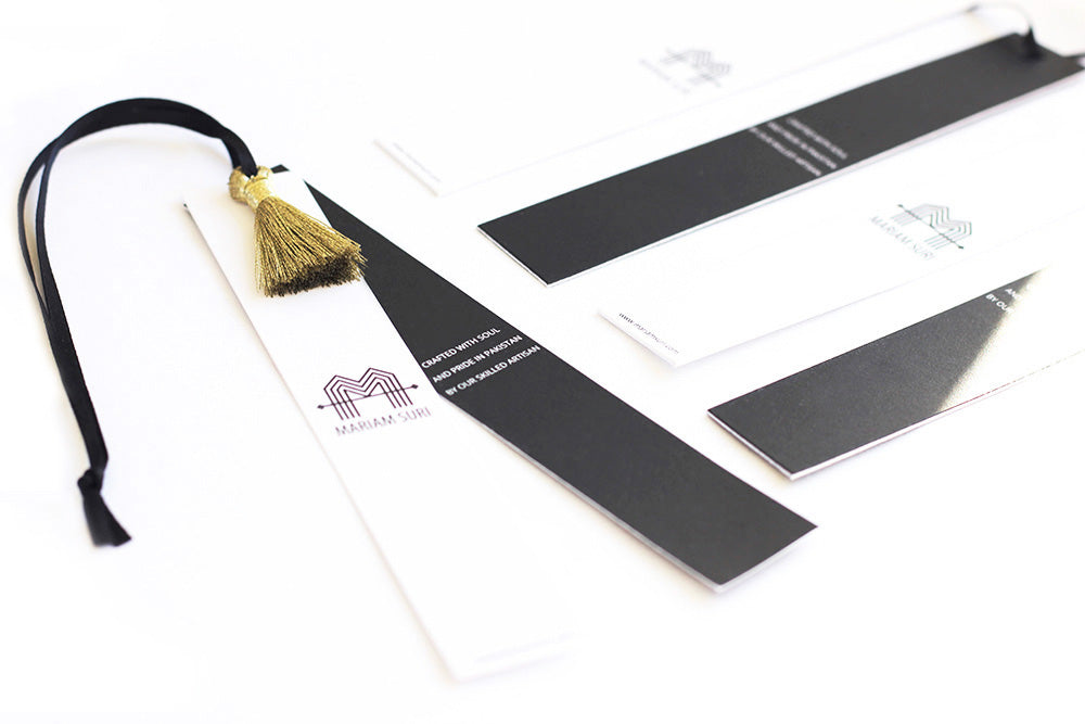Mariam Suri hangtags are made with FSC (FOREST STEWARDSHIP COUNCIL®) mixed paper that is produced using recycled papers or paper sourced from sustainable forests. The satin ribbon is crafted from recycled polyester yarns. The brand identifying gold tassels are produced in small quantities from left over fine gold thread.
