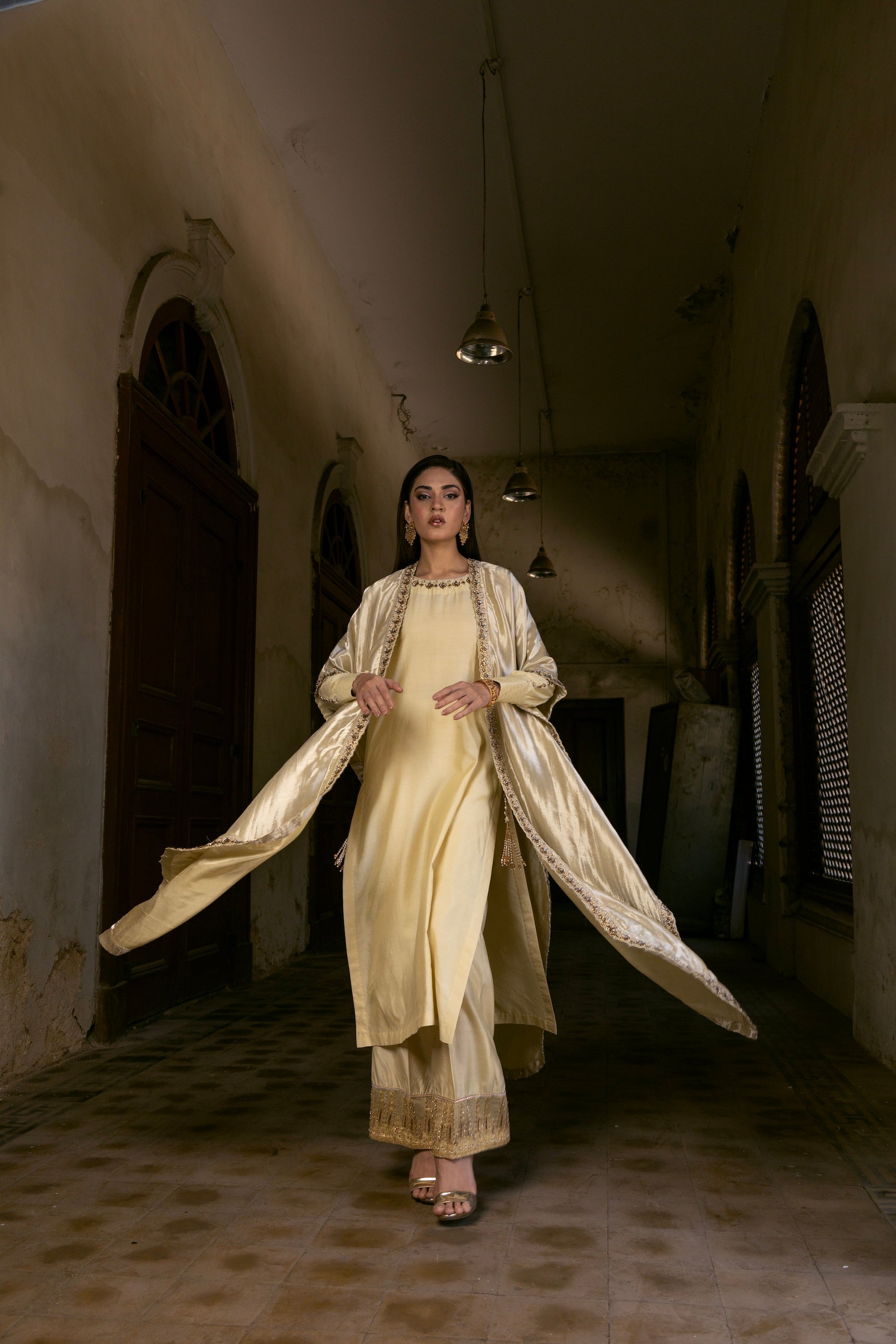Straight shirt with long sleeves and pleated cuffs in khaddi spun silk. Hand-embroidered sleeve and buttons. Custom tassels sewn into side slits. Paired with matching trousers finished with an embellished custom border. Cape in silk lamé, hand-embroidered and scalloped border.